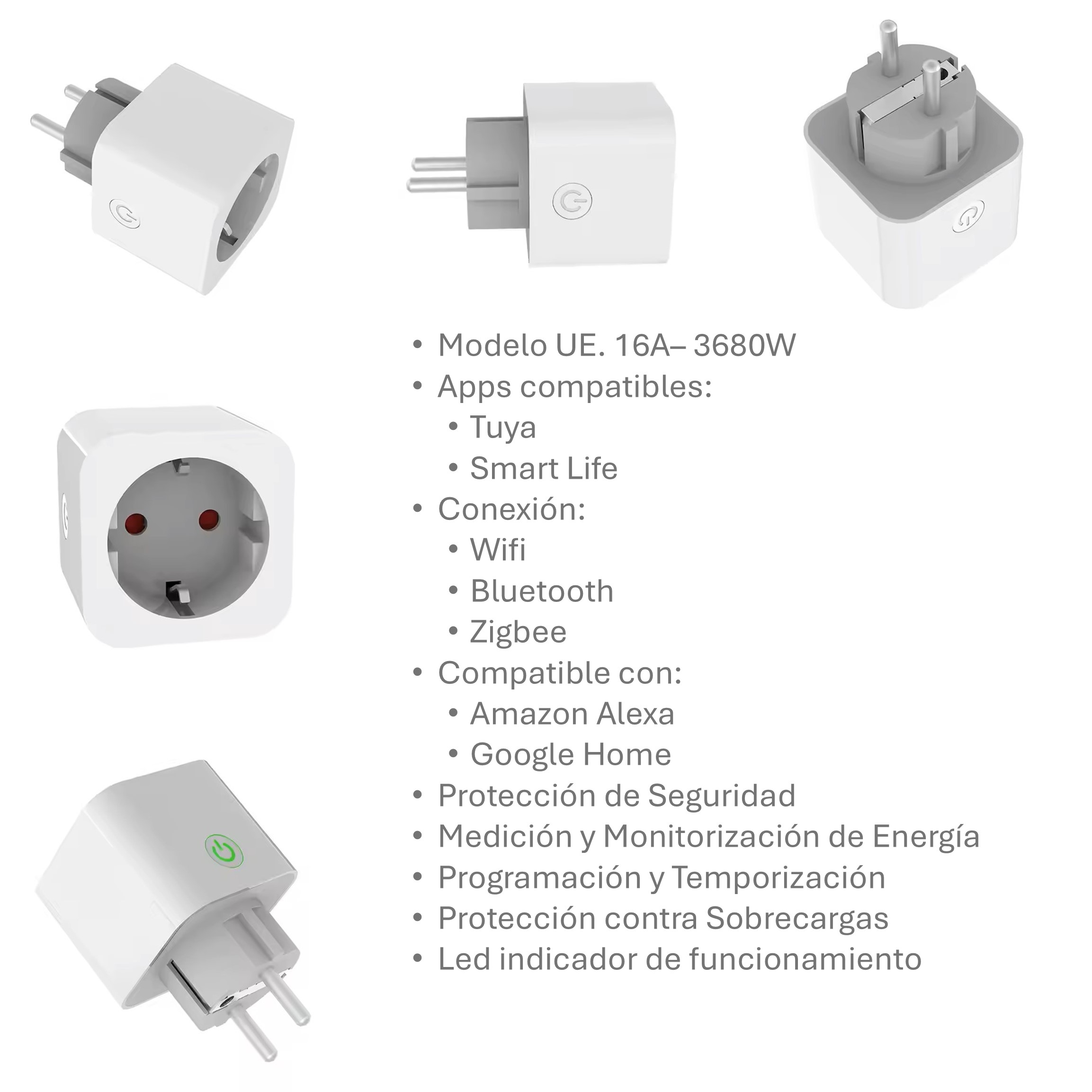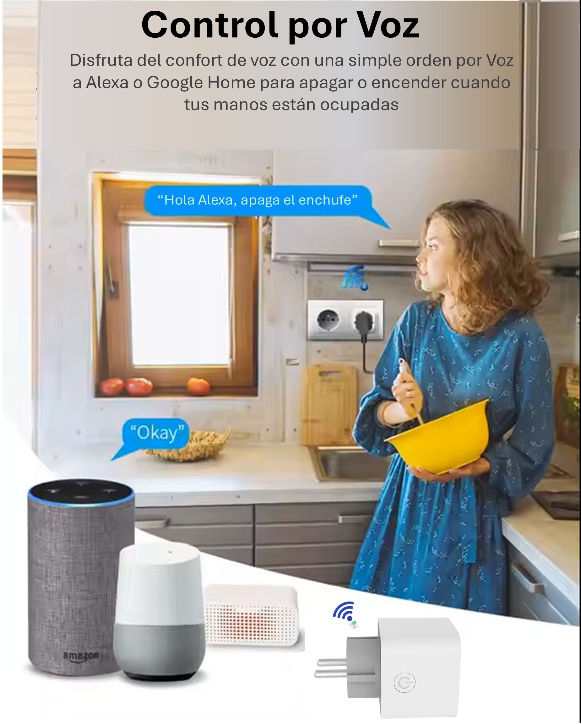 Control por voz. Integración con Amazon Alexa y Google Home para un manejo manos libres. Active luces, calefactores o pequeños electrodomésticos con simples comandos de voz.